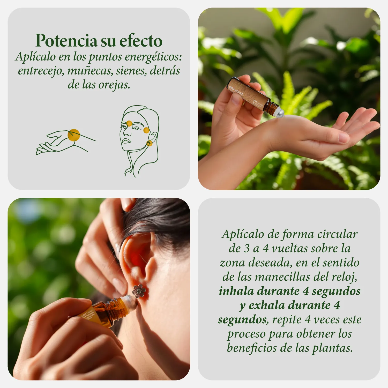 Aplícalo en los puntos energéticos: Entrecejo, nuca, muñecas, sienes, detrás de las orejas, etc. haciendo masaje circular e inhala profundo.